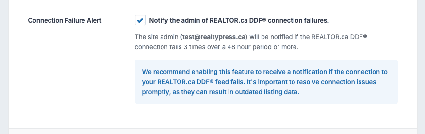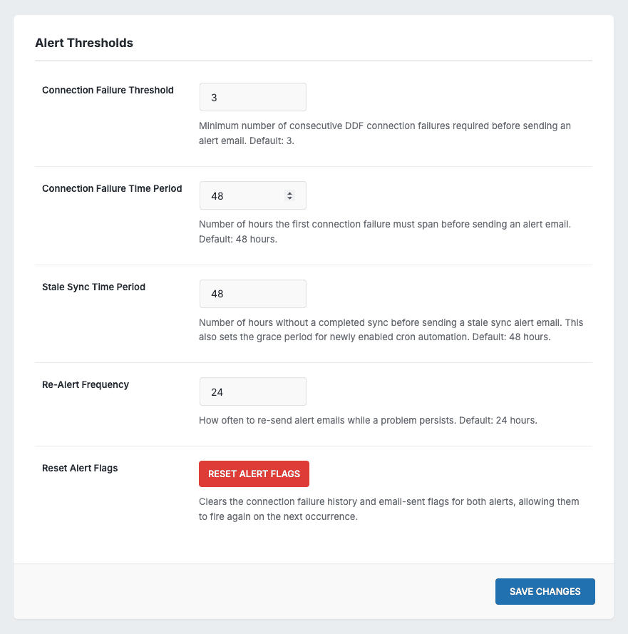 - DDF connection failure notifications — receive an email alert if your DDF connection fails 3 or more times over 48 hours.