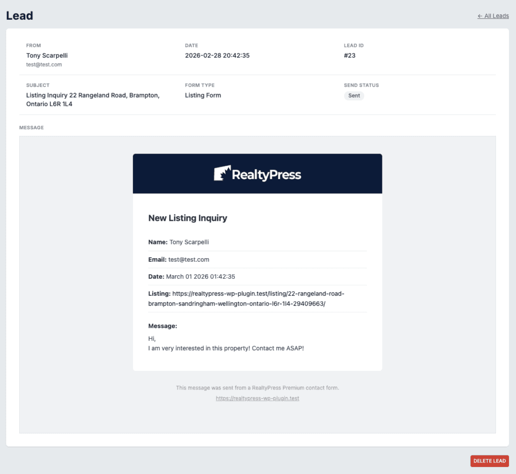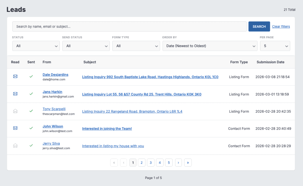 - New Leads admin page with a searchable and filterable table view of all contact form submissions.